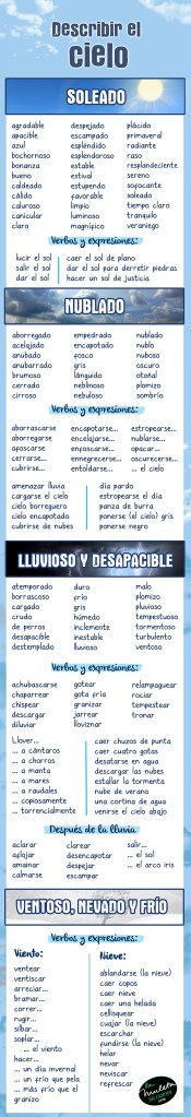 ¡Hola a todos! Hoy ampliamos la sección Meteorología con una nueva ficha donde encontraréis adjetivos y expresiones útiles para describir el estado del cielo de vuestros textos más soleados o… tormentosos.