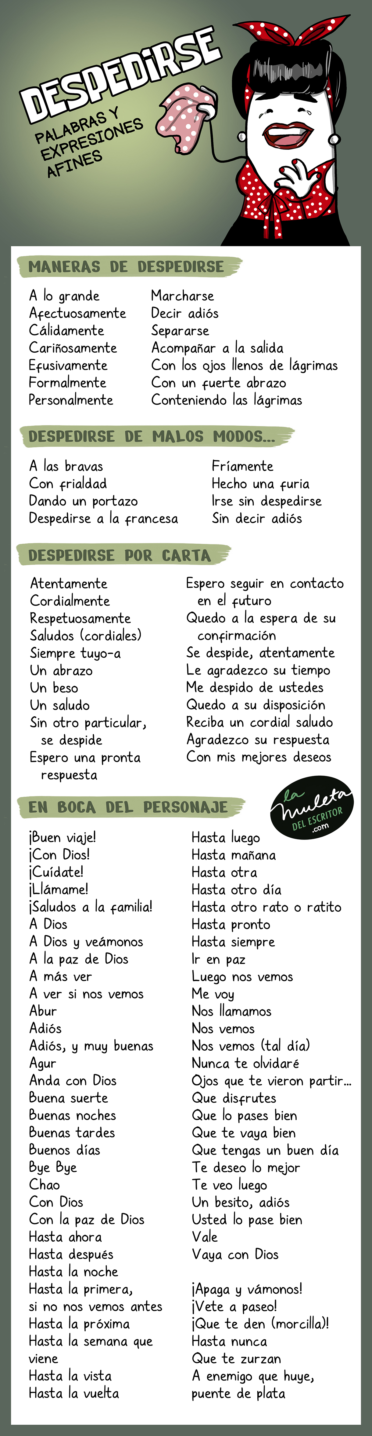¡Hola de nuevo, amantes de las palabras! Esta semana vamos a ampliar la extensa sección de expresión del personaje con dos nuevas infografías: Saludar y despedirse. En ellas encontraréis expresiones coloquiales que podrían salir de la boca de vuestro personaje, así como, maneras de realizar saludos y despedidas. ¡¡Chao!!