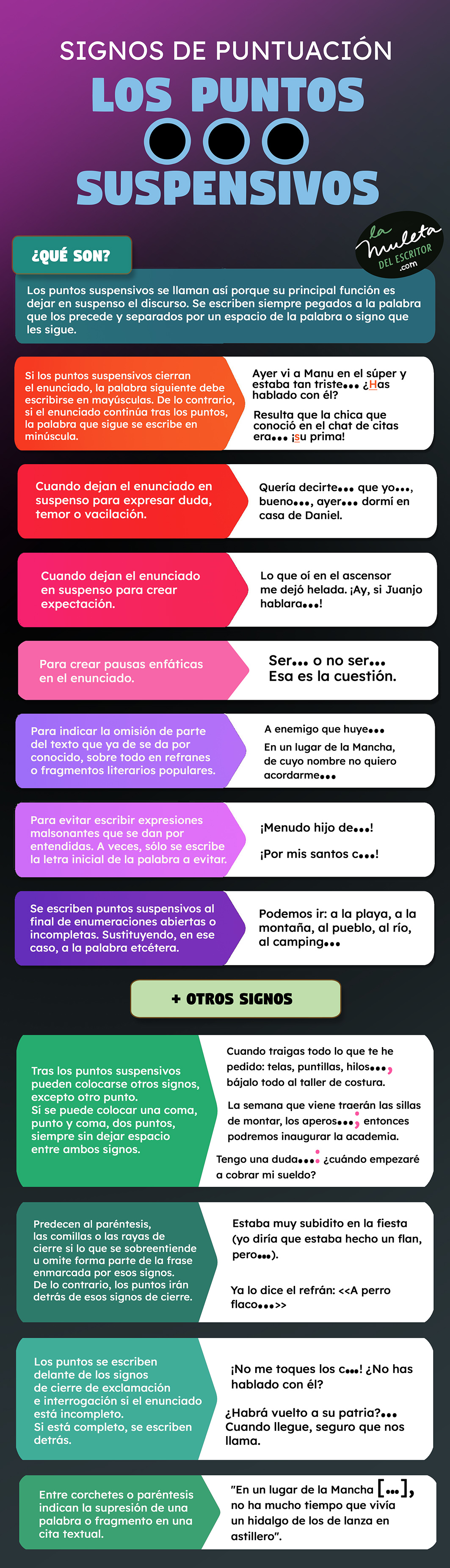 ¡Hola de nuevo, queridos amantes de las palabras! Hoy retomamos la sección de ortografía con una nueva infografía sobre los signos de puntuación. Esta vez, vamos a hablar de esos tres puntitos que, como su nombre indica, lo dejan todo en suspenso. Unos aliados insustituibles en los diálogos más enigmáticos o vacilantes. ¿O no…?