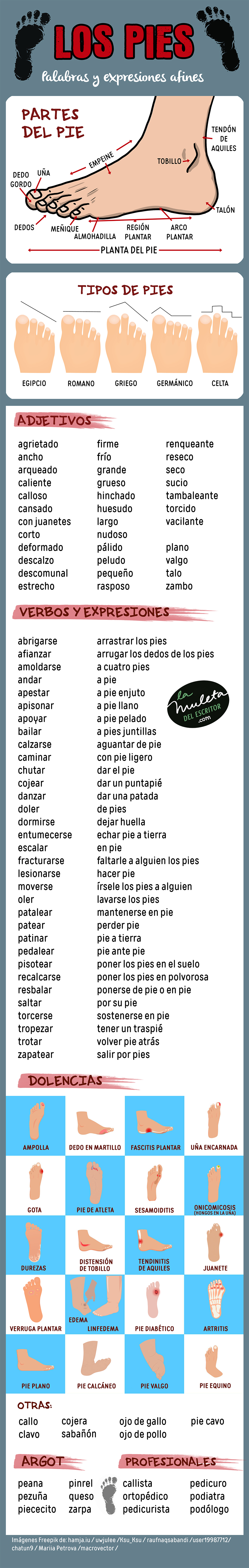 Aquí os dejo una infografía bien completita con imágenes ilustrativas de todas sus partes, la raíz ancestral según su forma y algunas dolencias comunes. Y por supuesto, muchos verbos y adjetivos para saciar la curiosidad de los seguidores más literarios.
