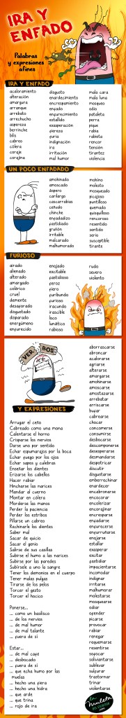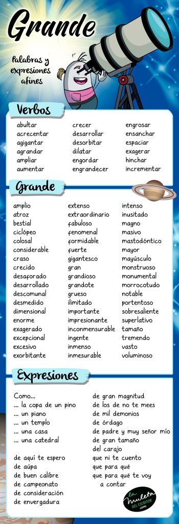 Para el que no conozca la finalidad de La muleta del escritor, le diré que se trata de una web destinada a ayudar a todo aquel (escritor o no-escritor) que desee encontrar las palabras, los verbos o los adjetivos adecuados para realizar sus descripciones, todo ello, simplificado mediante esclarecedoras fichas visuales o listas de ideas afines. Recientemente he incorporado una nueva sección (the writer’s crutch) donde versiono las fichas que ya se han publicado en inglés. Dicha sección crecerá semana a semana, también. Si todavía no conoces ninguna de las dos versiones de mi página, te invito a que les eches un vistazo: