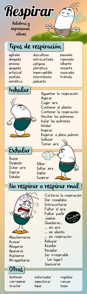 ¡Hola, amantes de las palabras! Esta semana la muleta del escritor os ofrece dos nuevas infografías sobre dos acciones habituales del personaje: respirar y cansarse. Porque, sin duda, cuando uno está para el arrastre, lo mejor que puede hacer es respirar, tomar el aire y renovarse. Quien más o quien menos, de vez en cuando, necesita un pequeño respiro para recargar las pilas cuando está exhausto. Empecemos: Ooooommmm.