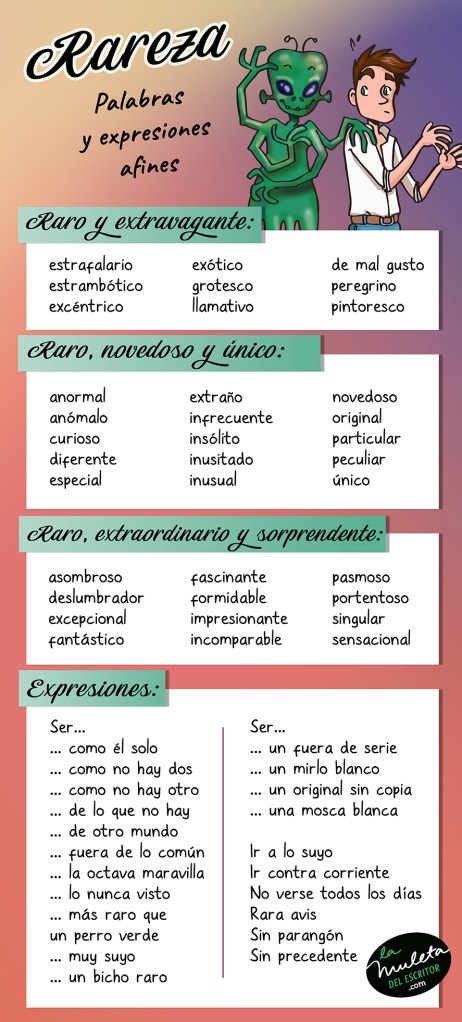 English is not my mother tongue, so why am I getting into this mess? After the success of this website, which was originally in Spanish, I have decided to translate these useful descriptive tools so that anyone who wants to start the adventure of writing can access them. Behind every infographic, there is a hard and painstaking work of searching, compiling, and organizing. I hope that my efforts to translate them will be of great use to you.