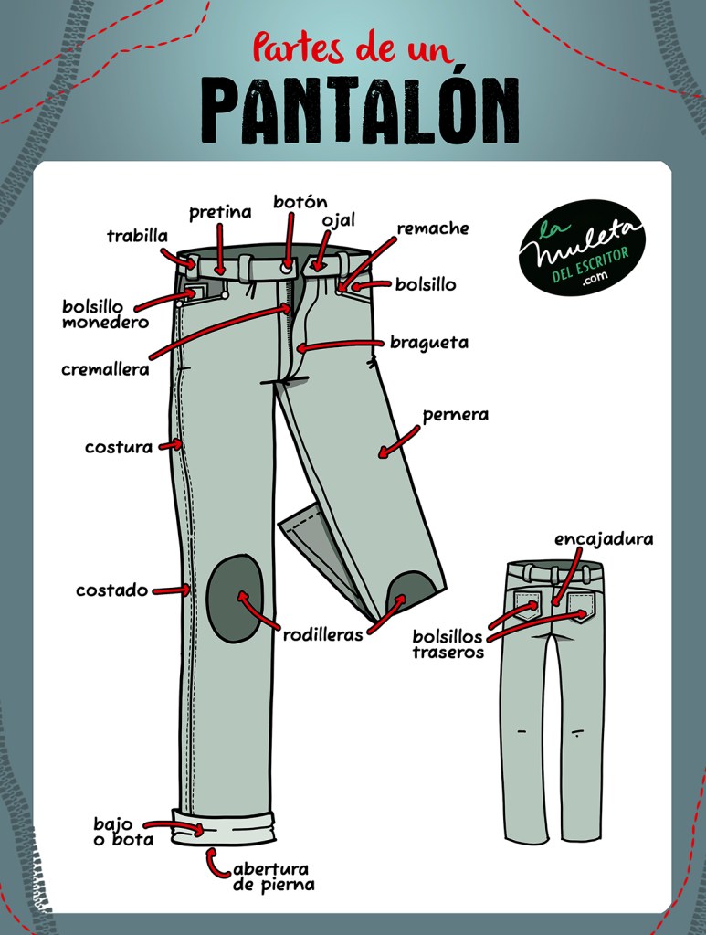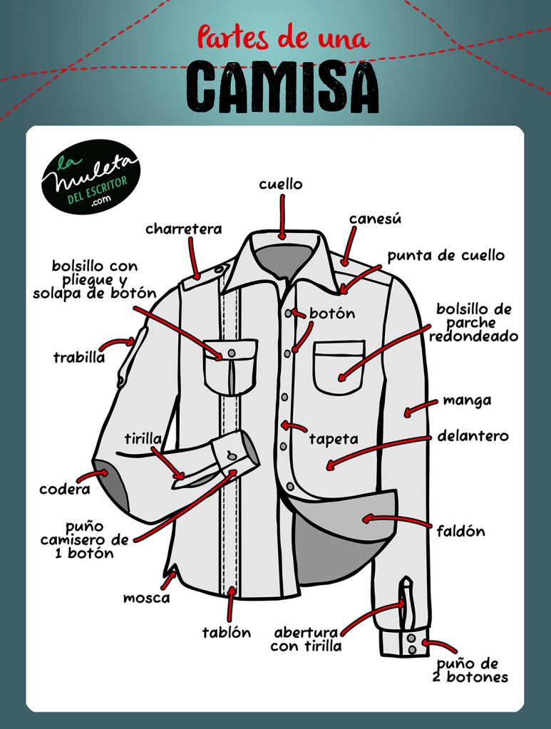 ¡Hola, queridos amantes de las palabras! Esta semana la sección de vestuario se amplía con tres nuevas fichas visuales, en esta ocasión, sobre las distintas partes de algunas piezas de vestir que usamos a diario: chaquetas, camisas y pantalones. Así, los personajes pueden arremangarse y sujetar las mangas de su camisa con las trabillas, o bien, meter el mechero en el bolsillo monedero de sus pantalones, incluso agarrar a su enemigo de la solapa de la chaqueta. Conocer las distintas partes del vestuario os ayudará a ser más precisos y enriquecer algo más vuestras descripciones.