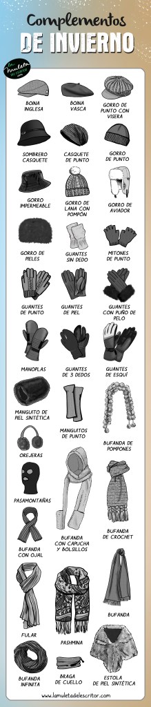¡Hola de nuevo, amantes de las palabras! Las fiestas navideñas han terminado y la muleta del escritor retoma sus publicaciones con fuerzas renovadas y nuevos propósitos. Como aquí, en el hemisferio norte, parece que el frío ya aprieta, vamos a dedicar la primera ficha de este 2023 a algunos de los complementos de vestuario que nos ayudarán a combatirlo durante el invierno.