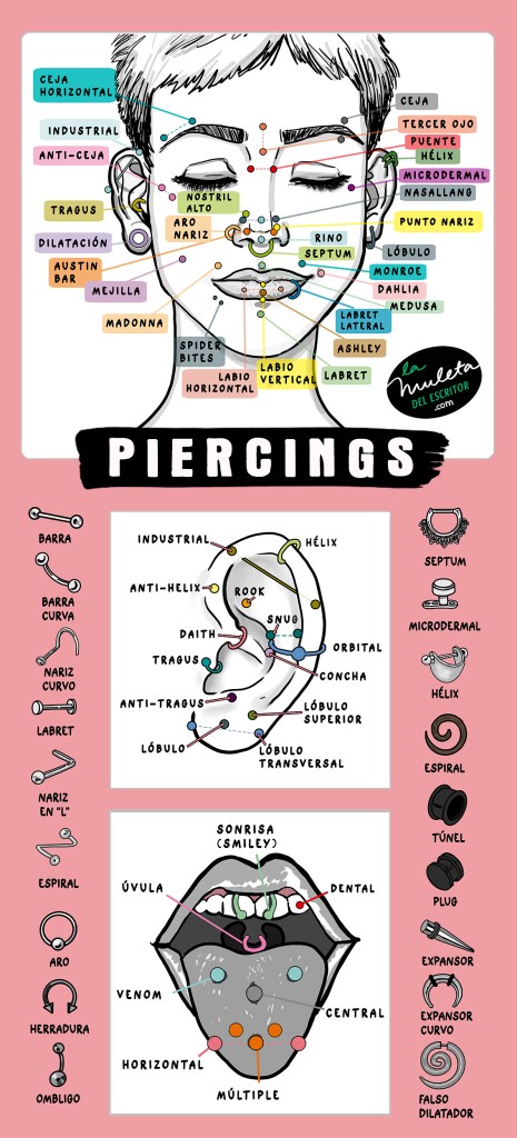 ¡Hola de nuevo, amantes de las palabras! Las dos nuevas fichas de esta semana inauguran una nueva subsección dentro del vestuario del personaje: la joyería. Para empezar, lo haremos con dos infografías sobre las joyas que actualmente están más en auge, los pendientes y los piercings.